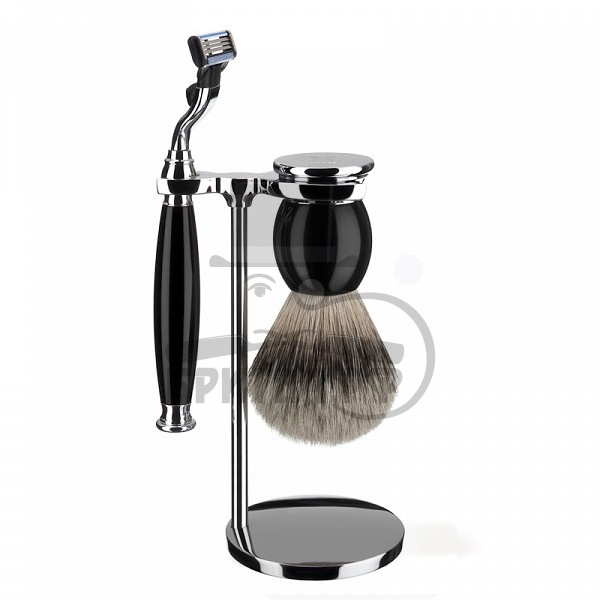 Черная смола - это высококачественный пластик. Материал идеально подходит для эксклюзивных аксессуаров, потому, что смола имеет широкий спектр современных и классических форм и множество привлекательных цветов. Массивная ручка - это основа эстетической формы для кисти и бритвы. Несколько человек заготавливают и шлифуют ручки в несколько проходов, чтобы запечатать поверхность и придать им особый блеск. Этот метод обработки придает комплекту приятное тактильное чувство и обеспечивает красоту в течение многих лет.