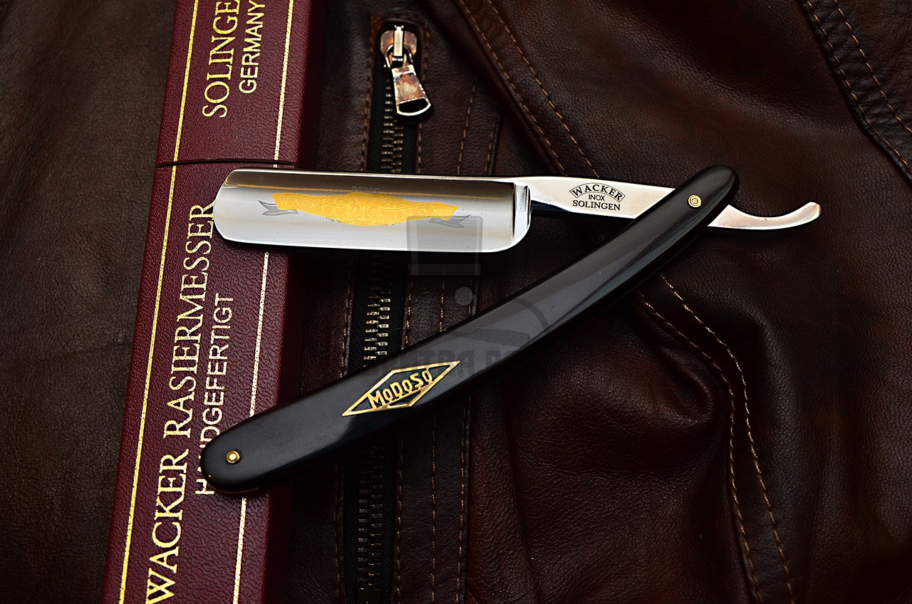 Ручка опасной бритвы выполнена из высококачественного пластика. Целлолуод прекрасно ложится в руку, не скользит, отлично переносит влажную среду использования, не боится падений. Темный цвет ручки с золотистой надписью MoDoSo выглядит изящно и по-мужски сдержанно. Название бритвы MoDoSo – это производное от первых букв бренда Dorten&Mochalski Solingen, одной из первых марок, зарегистрированных компанией Dorko.